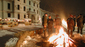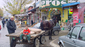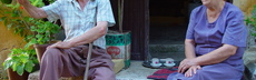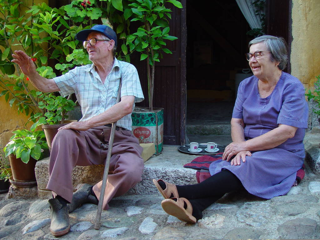 hebt seine Hand zum Gruss, ein Mann schleppt Brennholz herbei. Eine alte Frau
