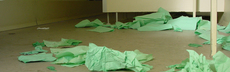 einen weissen Strich über das giftgrüne Tuch und drückt auf das Lineal.
