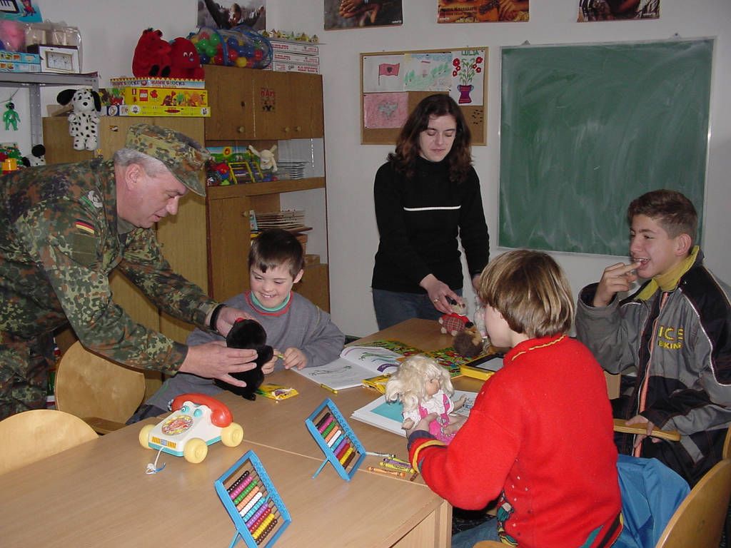 Ein Opfer des Krieges lebt heute in der Schule. Der Mann muss im Alter von 34 Jahren nochmals lesen lernen. Er hat für die UCK gekämpft und ist im Wald auf eine Mine getreten. Vom Haaransatz bis zum Kinn ist eine Narbe zu sehen. Während der 30-stündigen Operation wurde das ganze Gesicht weggeklappt. Diese hat er überlebt. Das Augenlicht kommt nie mehr zurück.