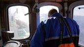 steht am Steuerrad. Aus dem Lautsprecher des Funkgerätes dringen blechern