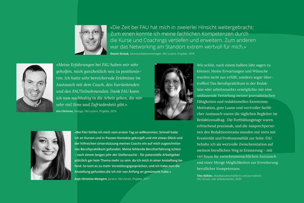 Fokus Arbeit Umfeld. Nachhaltig in die Arbeit. Der Name ist Programm: FAU hat seit seinem Bestehen 10 000 Menschen mit hohen beruflichen Qualifikationen bei der Suche nach einer geeigneten Stelle begleitet und unterstützt. Heute beschäftigt die Organisation, die primär vom Staatssekretariat für Wirtschaft SECO finanziert wird, 50 Mitarbeitende. Jährlich rund 600 Hochqualifizierte erhalten regelmässiges Coaching, besuchen Fachkurse und arbeiten an einem eigenen Projekt, um eine passende Stelle zu finden. Der Einsatz im Programm, der bis zu sechs Monate oder bis zu einem früheren Stellenantritt dauert, wird vom RAV koordiniert. Der vom SECO finanzierte Programmteil kostet im Jahr um 6 Millionen Franken. Trotzdem ist das eine Rechnung mit Gewinn. Berechnungen des SECO zeigen, dass ohne Programmeinsatz doppelt so hohe Ausgaben durch die Arbeitslosenversicherung anfallen würden, da die Leute ohne Unterstützung deutlich später eine Stelle finden. Die Stellenantrittsquote beträgt im langjährigen Durchschnitt bei gegen 80 Prozent. Dies beinhaltet Stellenantritte während des regulären Programmeinsatzes oder bis drei Monate nach dem Austritt aus dem Programm.