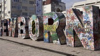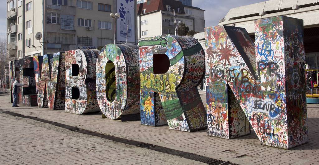 Stahlblech stehen unverrückbar vor dem im sozialistischen Styl erbauten monströsen Jugend-, Kultur- und Sportpalast in Pristina. Zuerst waren die jungen Symbole versehen mit unzähligen Unterschriften, dann bemalt mit den Flaggen der Länder, die den Kosovo als unabhängigen Staat anerkannt haben, später mit militärischen Tarnmustern gestaltet. Bemalt und zerkritzelt erinnern sie nun an den 17. Februar 2008. Newborn. Ein neues Land. Ein neuer Stolz. Symbol für Aufbruch, beliebtes Fotomotiv.